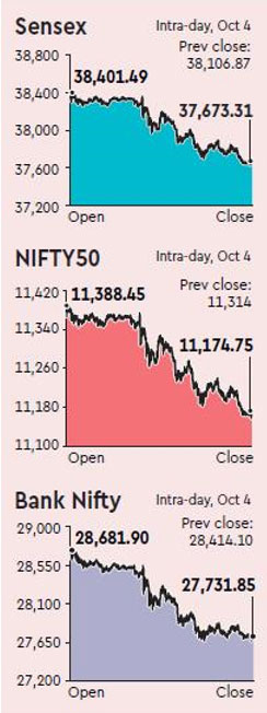 While the Sensex slid 433.56 points, or 1.14%, to close the session at 37,673.31 points, the broader Nifty50 lost 139.25 points to settle at 11,174.75. Four banks — HDFC Bank, ICICI Bank, Kotak Mahindra Bank and Axis Bank — among them contributed about a third of Sensex’s fall on Friday.