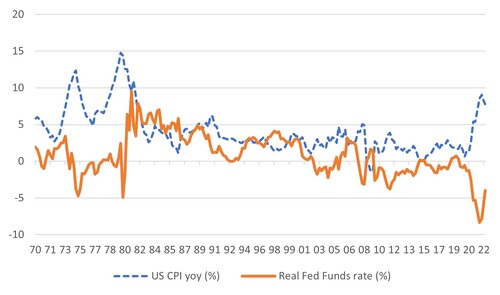 Global inflation may have peaked, but there is little comfort for central bankers that inflation will reach its targets anytime soon. In the US, the real fed funds rate remains well below the rate of inflation. Central banks usually only tame inflation when policy interest rates are above the inflation rate. As we have persistently argued, it is wishful thinking that central banks can tame inflation with a few rate increases that do not create slack in the economy. The US economy remains at full employment. The unemployment rate is at a 30-year low of 3.7%. The lack of slack in the labour market is pushing wages higher; last week’s US labour report showed average hourly wage earnings growing at 5.1% – a significant surprise to the upside versus market expectations.