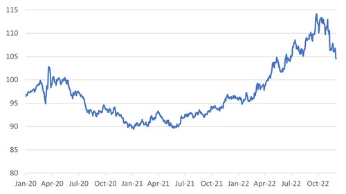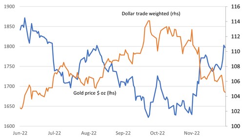A sharp rise in the gold price has accompanied profit-taking in the dollar.The gold price is up 10% from its low of early November. We continue to believe that gold is a valuable asset in dollar cash management. Switching from dollar cash to gold at the peak of the dollar’s trade-weighted performance would have been a valuable source of added value – easier said in hindsight, but food for thought if we see any further spikes in the dollar in coming months.