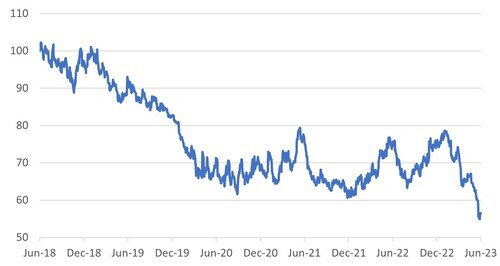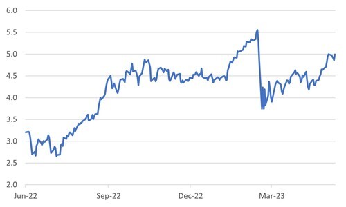 To be honest, it doesn’t matter whether the Fed raises rates in June or July. The market’s pricing of the Fed funds rate level at end-2023 is back to its recent peak of 5.0%. However, given the recent global as well as US economic data flows, the chances of an imminent recession have markedly receded – putting extra pressure on central banks to do more. It remains fanciful that the Fed’s year-end policy rate could be at or below 5%. The Fed and other central banks are likely to have to do more.