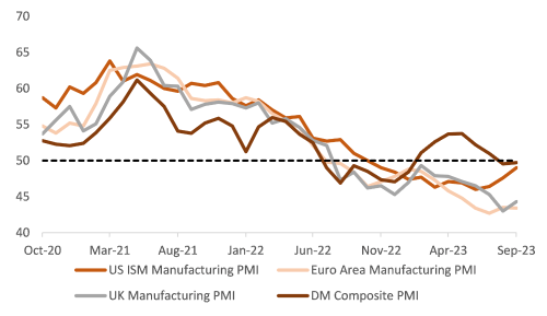 We watch for and acknowledge positive data as well. For instance, the manufacturing sector in the US has been under pressure while services has been holding up. However, the recent DM manufacturing reading indicates some respite, although it is still in the contractionary zone.