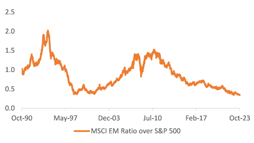 The pessimism in sentiment has spilt over to EM as a whole. Bloomberg points out that MSCI EM is at the weakest-ever level relative to the S&P 500 Index in data since 1987. Trends like these tend to mean revert and richly reward patient investors.