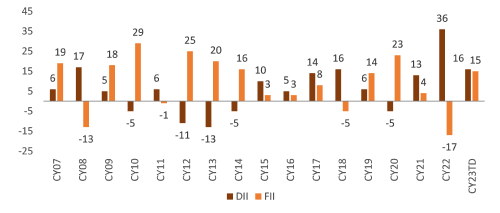 equities. Domestic flows continue to be supportive. Monthly SIP flows have now touched 16,000 crores,