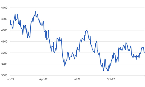 The US equity and bond markets hit their resistance levels at the 200-day moving average in the past week. The US 10-year bond yield fell to a recent low of 3.32%, almost close to the 200-day moving average, before rebounding to 3.43%. The S&P500 market touched 3999, briefly crossing the 200-day moving average of 3981 before falling back. We suspect that the weaker economic data and a poorer outlook for corporate profits could, in the near term, see the S&P500 re-test the October low of 3577, roughly 8% lower than the current levels.