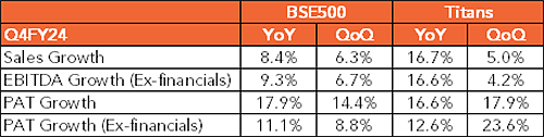Here is how the aggregate earnings looked in the quarter for the BSE500 and Sanctum Indian (Titans) portfolio.